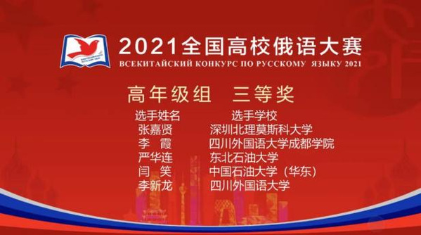 初赛于2021年10月23日举行。本次大赛是有史以来规模最大、范围最广、参赛院校最多、选手实力最强的一届,共有来自全国150所高校的390名选手参加,并设低年级组、高年级组、研究生组三个参赛组别,经初赛、复赛、决赛三轮比拼,最终角逐出60名获奖选手。在为期两天的系列赛事中选手们切磋技艺,以俄语会友,展示新时代俄语专业大学生的风貌。曹源同学以第19名的成绩从低年级组154名选手中脱颖而出,顺利挺进复赛,以第13名荣获低年级组三等奖;闫笑同学在高年级组165名选手中排名第21进入复赛,以第21名荣获高年级组三等奖。